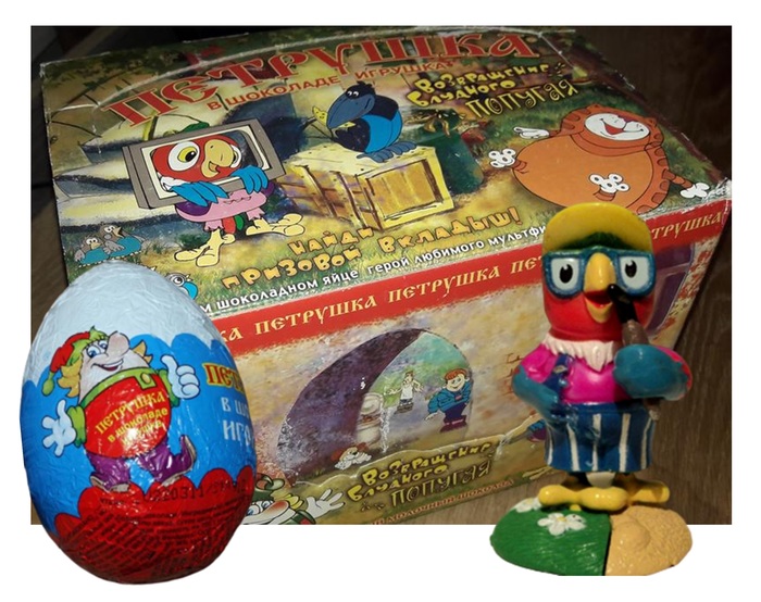По пути домой мы заглянули в небольшой магазинчик, где над витриной с колбасой, у кассы, располагалась красивая коробочка с уже полюбившимися нам шоколадными яйцами. Папа подошел к среднего возраста продавщице, попросил "двух "Петрушек", положил 10 рублей и после показал на мой фингал, наверное тоже имевший какой-то номинал в рублях:D Я слабо помню их диалог, помню лишь, что продавщица была довольно доброжелательной и заветных "Петрушек" нам все-таки выдали. Они были тогда не такие дорогие, как "Киндеры" в нынешнее время, но почему-то вот в таком виде эта сделка запомнилась мне тогда и сквозь годы сохранилась в памяти. Я шел с улыбкой на лице и крепко сжатым шоколадным яйцом в руках. Я рос не слишком эмоциональным и общительным ребенком наверное, но со 100% могу сказать, что это было и стало одним из самых ярких детских воспоминаний. А из яйца в итоге "вылупился" представленный ниже попугай Кеша - не первая и не последняя "в шоколаде игрушка" от уже оставшейся в истории компании
