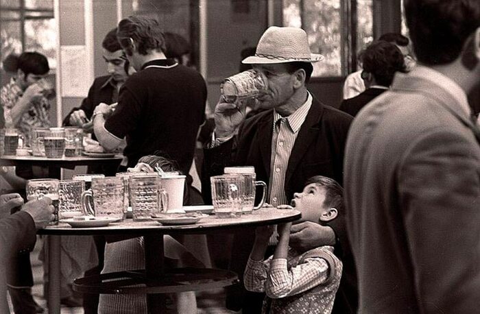 Если собственной тары не было, покупатель заказывал «большую с прицепом»: залпом выпивал маленькую кружечку, а с собой брал стакан побольше. Так начиналось утро рабочего дня простого человека в эпоху пивного алкоголизма.