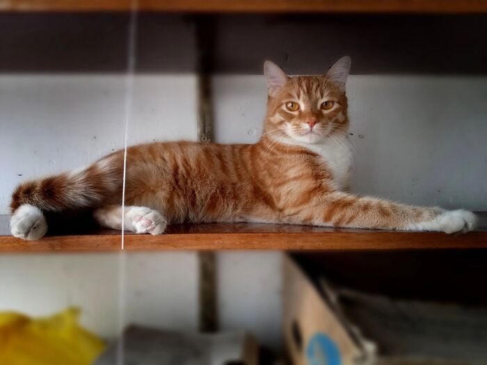 Не смотря на величественный вид, он глуповат и очень трусливый. Нашу Тусю он полюбил сразу и на всю жизнь, мы больше не смогли их разлучить. Спустя два месяца отвезли Шурика домой к маме, он там метался, мявкал, беспокоился. Пришлось везти его к нам обратно. Привезли. он кинулся к Тусе и успокоился сразу же. Так и живут вместе.