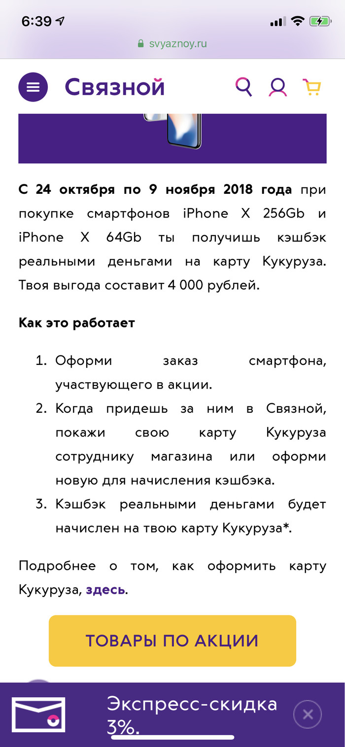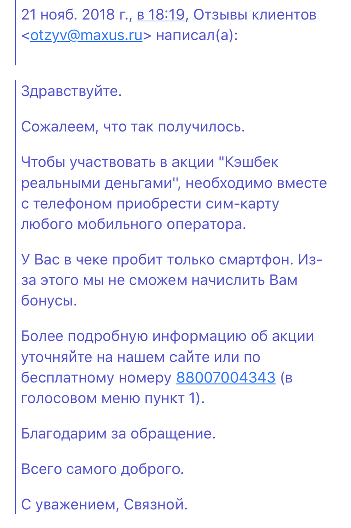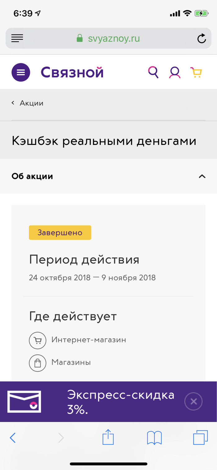 Всем доброго вечера/утра/дня/ночи! (Нужное подчеркнуть). На фоне https://pikabu.ru/story/mvideo_quotnam_vse_ravnoquot_6326804... вставлю свои «5 копеек» про бешеные акции. В магазине со словом «связь» и междометием «ой» в октябре сего года проходила очешуительная по щедрости акция «кэшбэк реальными деньгами». Каюсь, погнался не за ними, а просто за телефоном.