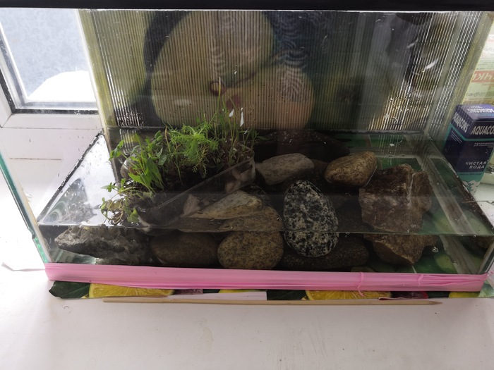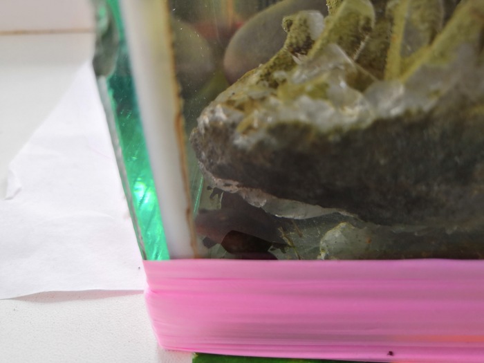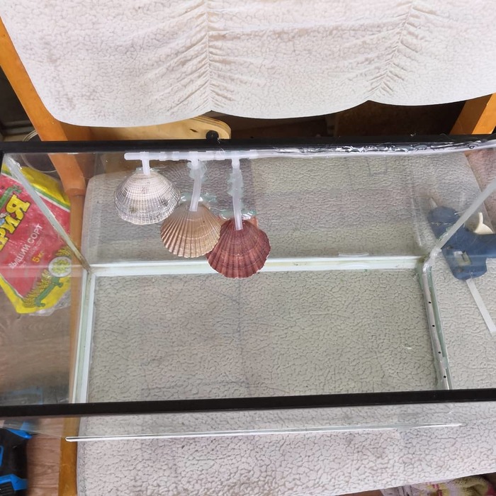 Сначала пришлось выселить Салапендру в другое помещение, это была пластиковая бутылка с небольших количеством воды. Далее было выкинуто все акватеррариума, помыто, высушено и заделаны прохудившиеся швы между стёклами. Приклеил трубочки, ракушки и в угол на дно алюминевую трубку с отверстиями для подачи воды.