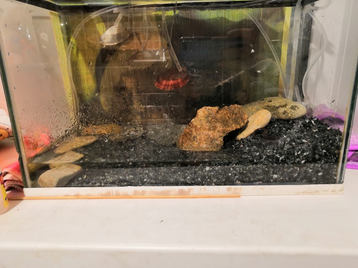 После, засыпал мелкий щебень накидал камешков, соединил трубочки, моторчик запитал телефонной зарядкой. Налил воды, посадил ящерку... И вот водопад готов и вода фильтруется немного.