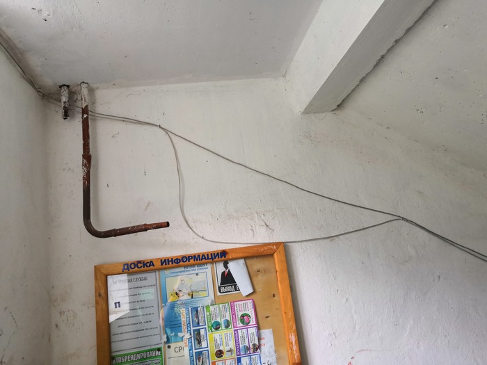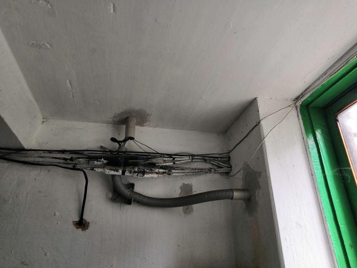 Обратите внимание на чёрный провод в трубе, скручен почти в узел. А это оптика, так гнуть её нельзя. Ну и общее безобразие.