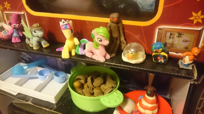 Тут даже она свой сюжет придумала, и про всех рассказала кто чем занимается. На столько много разных мелких персонажей из пластилина, просто фигурки из киндера, что порой удивляюсь как вобще можно все это придумать. Понравилась больше всего ворона на дереве и бешенные кролики.