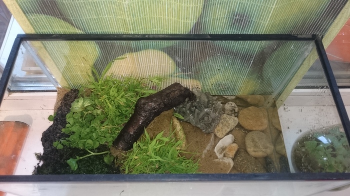 В скором времени хочу дополнить акватеррариум мелким искуственным газоном по стенками изнутри, положить мох, палочки разные. Ну и надеяться что Ящерка не будет шугаться после двух лет тишины.
