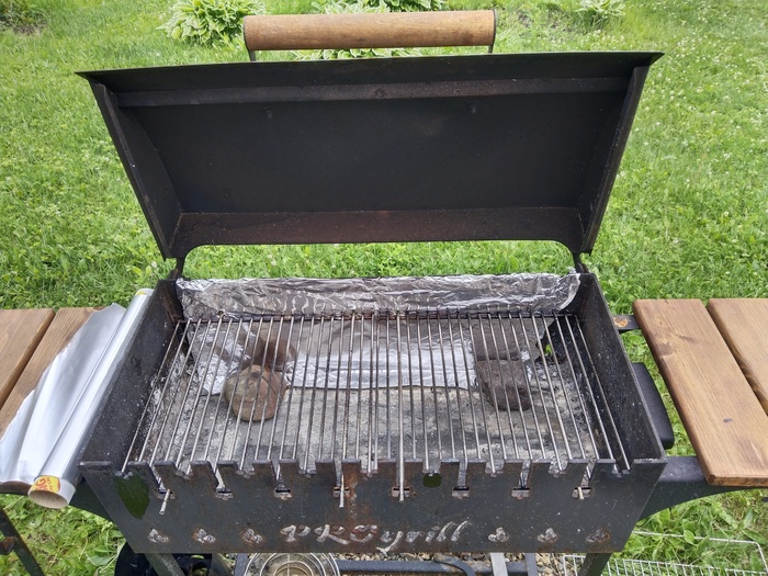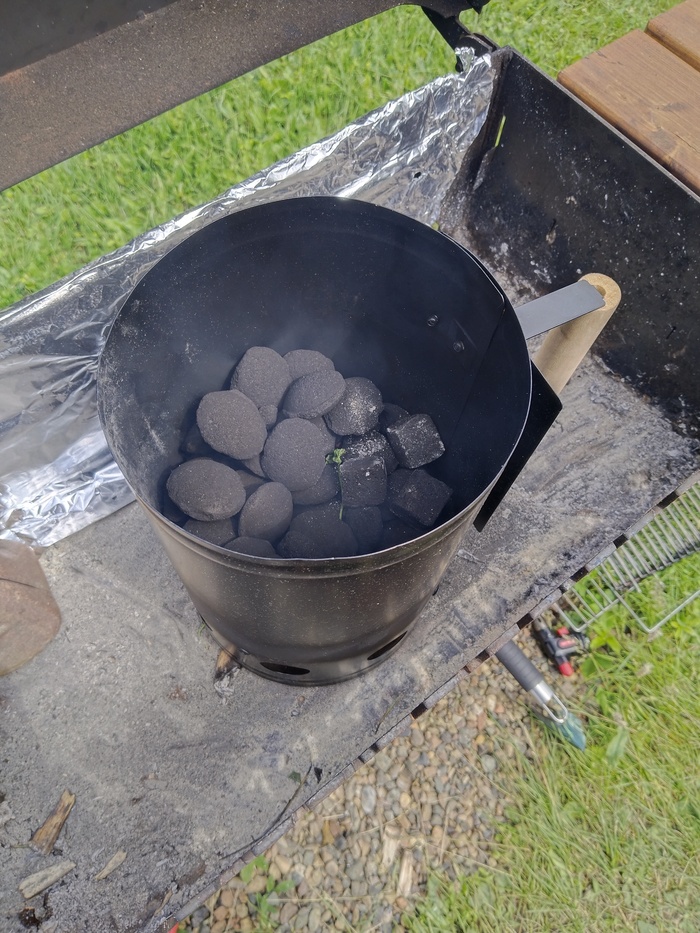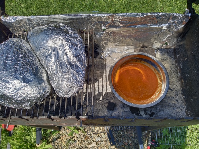 Так как приготовление долгое, для источника энергии были выбраны угольные брикеты. И по этой же причине пришлось при помощи фольги доработать мангал (слишком много отверстий, в связи с чем брикеты быстро прогорают)