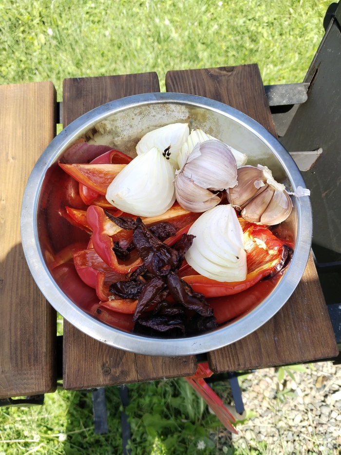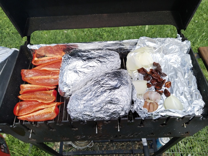 Пока брикеты разгораются в стартере, заворачиваем рульки в фольгу (3-4 слоя) и режем ингредиенты для печеного перечно-чесночного соуса(перец сладкий - 2шт., Шоколадные Хабанеро с подоконника - 7шт., головка чеснока и луковица). Потом все это водружаем на мангал: