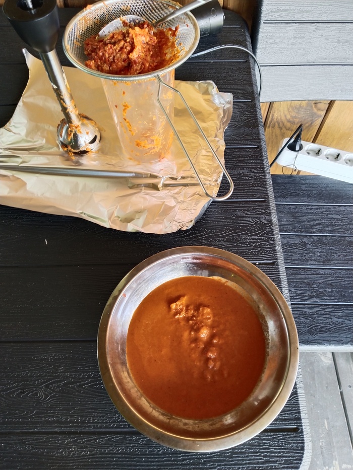 После измельчения, долго и муторно перетираем жижу через ситечко, для однородности структуры.