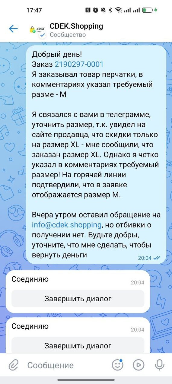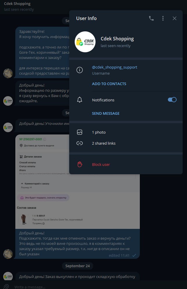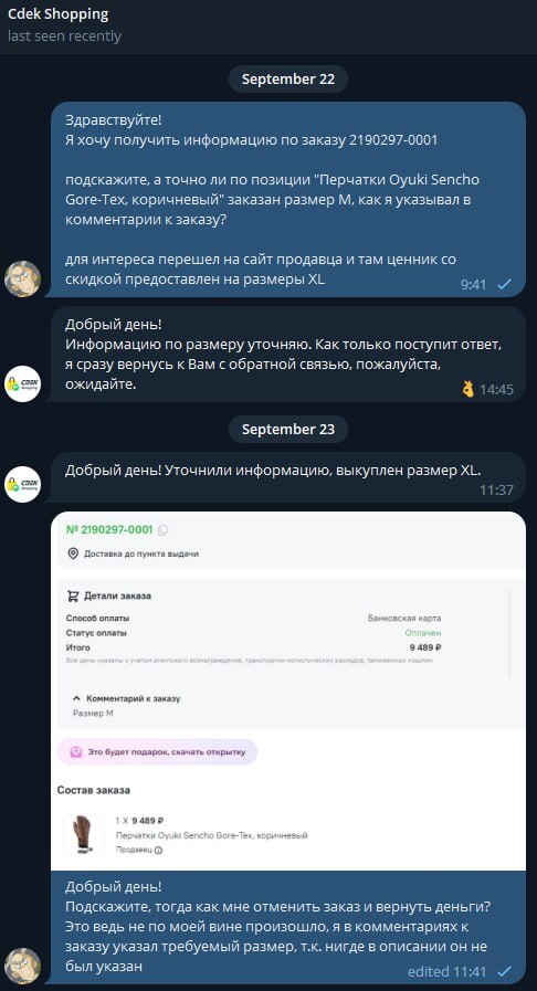 21 сентября в 20:10 мне на почту пришло уведомление, что товары в пути на склад отправления. На следующий день утром, т.е. 22 сентября я прочел письмо, обрадовался покупке, зашел в личный кабинет и в разделе с заказами нашел информацию о продавце. Решил посмотреть, что там на сайте у него и обнаружил, что данные перчатки со скидкой стоят 59,99$ и продаются только с размером XL. Пабам. Возможно просто выкупили размер, который я заказывал? Решил уточнить на всякий случай. Зашел в телеграм и написал в службу поддержки CDEK.Shopping