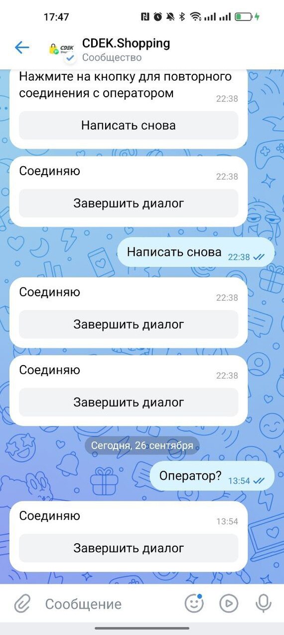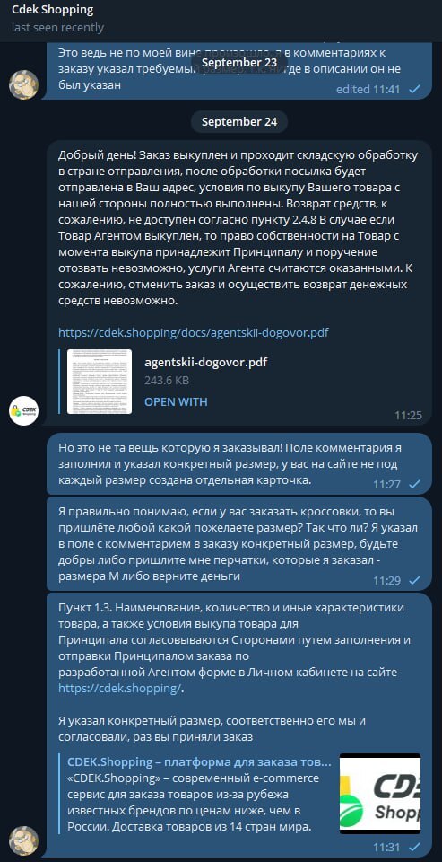 Подождав час и понимая, что на этом в телеге мне никто более не ответит (до сих пор не прочитаны сообщения) я решил пролистать сайт и найти условия отмены-возврата. Подготовил обращение и направил на почту info@cdek.shopping