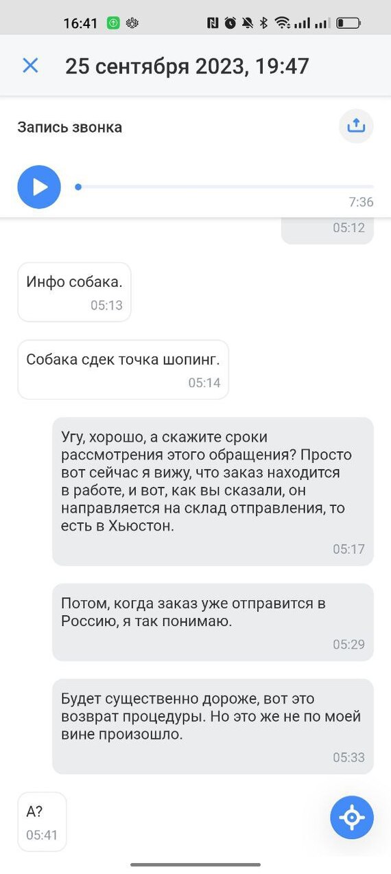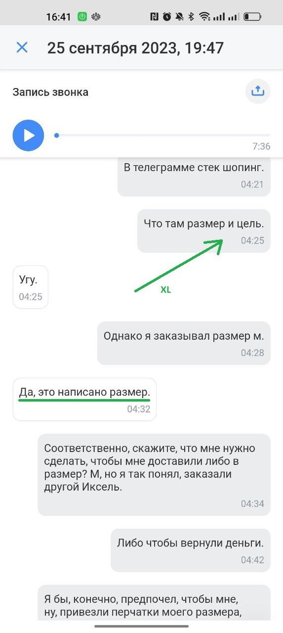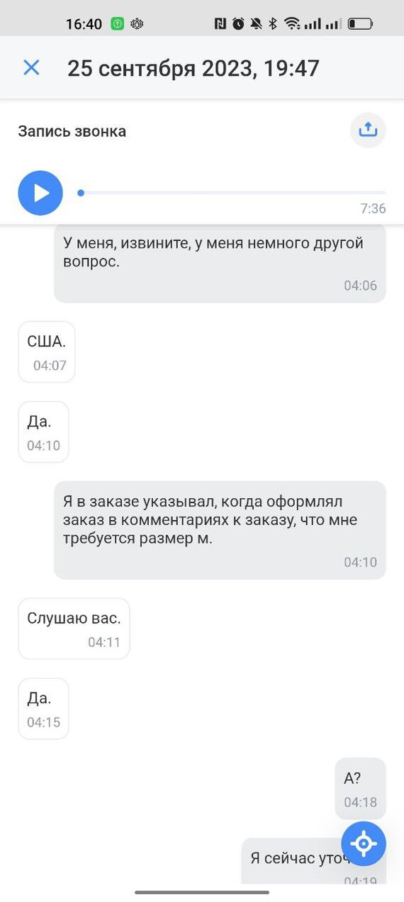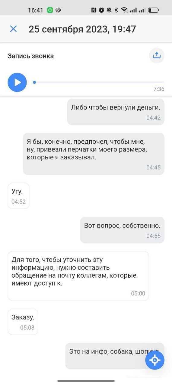 Никакой отбивки о прочтении/получении письма я не получил, поэтому решил попробовать еще один канал взаимодействия. Нашел номер горячей линии, обратился на нее. Там мне подтвердили, что у меня указан размер М (04:30, запись разговора велась и сдэком, и олегом). Однако помочь ничем не смогли, только сказали оставить обращение на info@cdek.shopping (что я уже сделал).