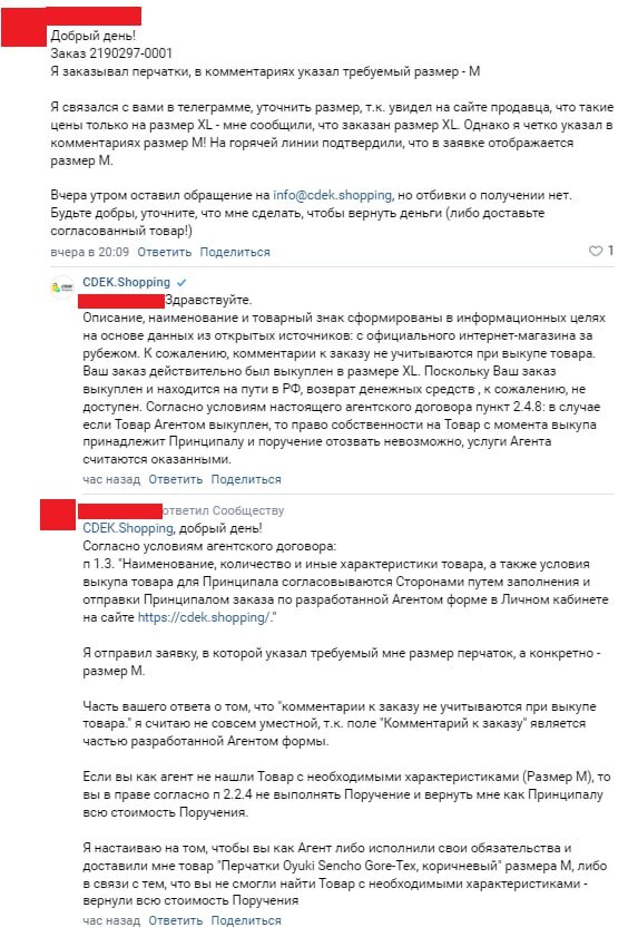 Заказал перчатки размера М через CDEK.Shopping, т.к. отсутствовала информация о размерах указал в комментариях, что требуется размер М. Байер СДЭК решил выкупить перчатки другого размера -- XL. Сам СДЭК утверждает, что поле "Комментарий к заказу" к заказу не относится.