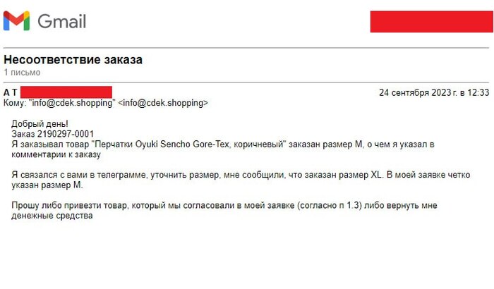 Прошу помощи у сообщества. Что мне делать? Судя по всему позиция СДЭК товар который я заказал, все что указано в заявке но без одного поля в форме заявке. Как по мне, нужно учитывать все в комплексе, поле комментарий - неотъемлемая часть заказа. Соответственно заказывал я ТОВАР = "Перчатки Oyuki Sencho Gore-Tex, коричневый размера М".