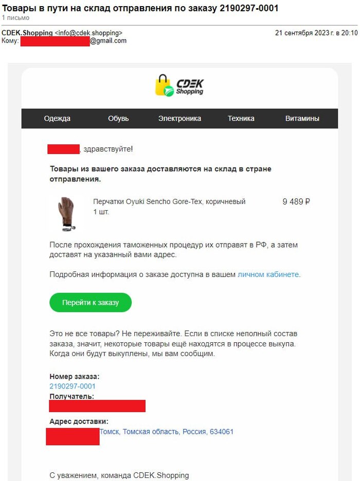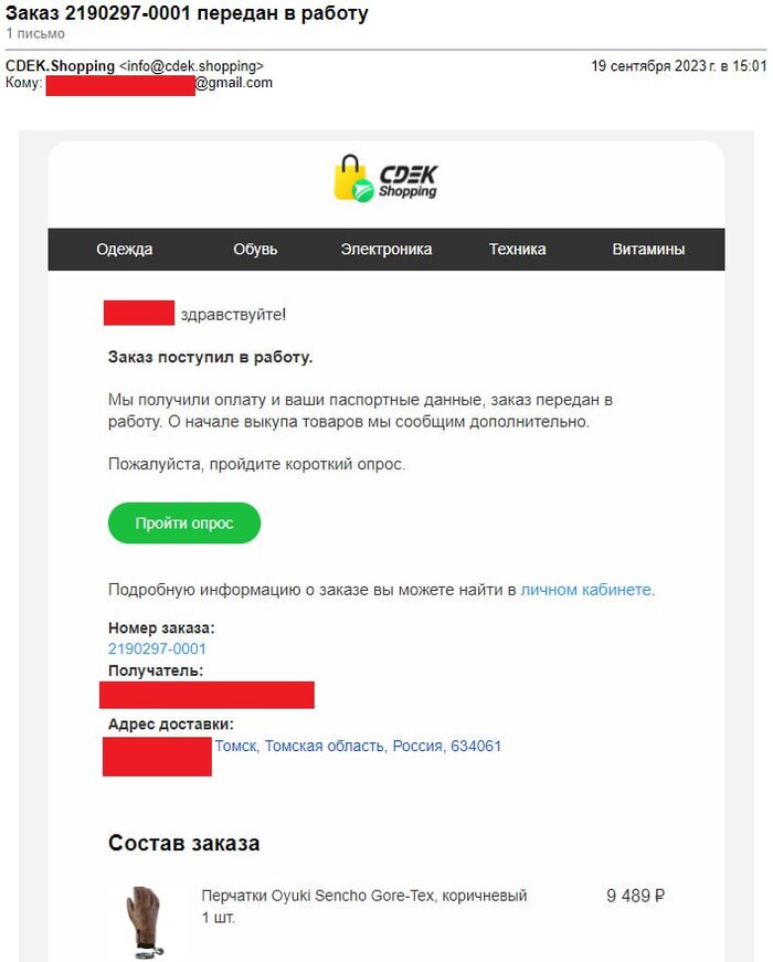 19 сентября в интернет магазине CDEK.Shopping я оформил заказ 2190297-0001, который состоял из одной позиции - это перчатки "Перчатки Oyuki Sencho Gore-Tex, коричневый". Особо подчеркну, что на сайте момент заказа не было выпадающего списка с размерами (это поправили после моего обращения). Поэтому в поле "Комментарий к заказу" я указал, что мне требуются перчатки размера М. В тот же день получил сообщение о том, что заказ передан в работу.