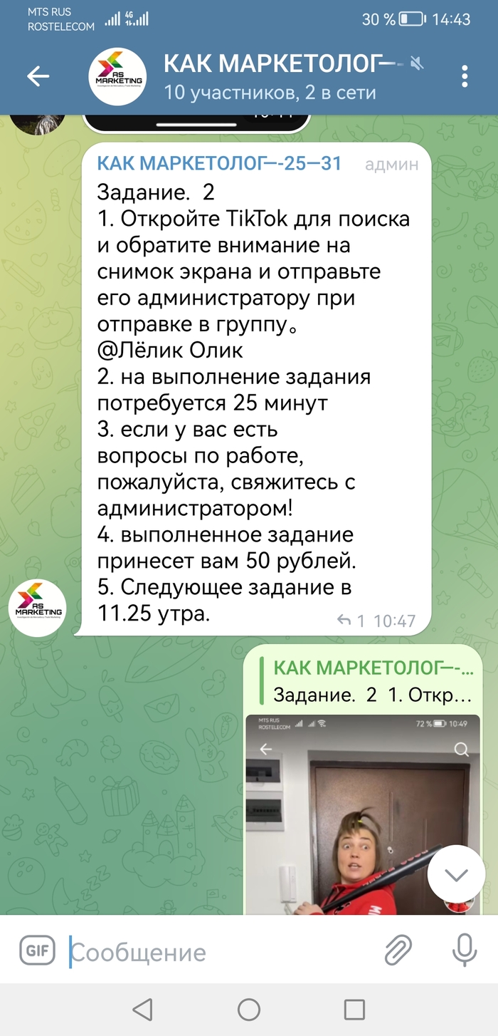 Любопытство взяло верх и на следующий день начали присылать задания. Первые два задания были связаны с лайками в тик токе (1 лайк 50 руб).