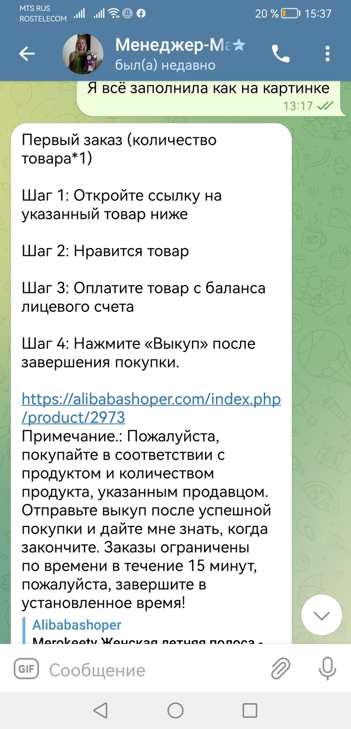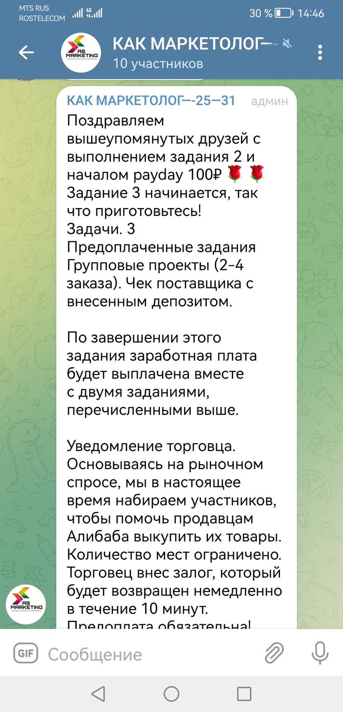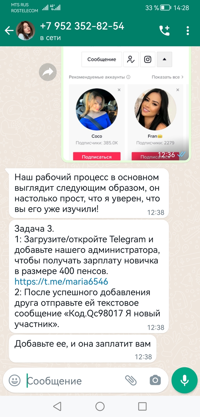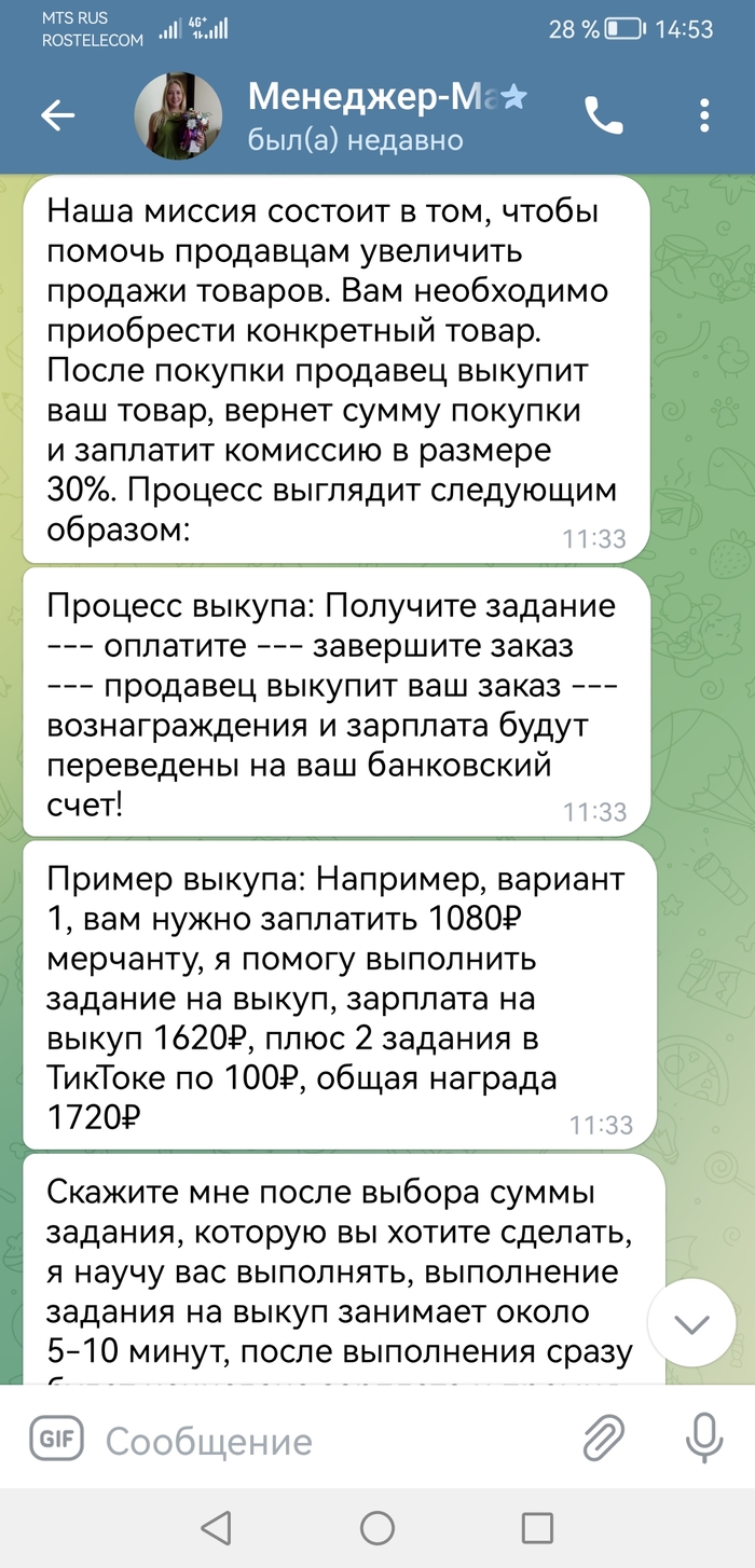 Потом меня добавили якобы в рабочую группу телеграмма где по заявлению менеджера каждый день будут давать задания и платить за них.