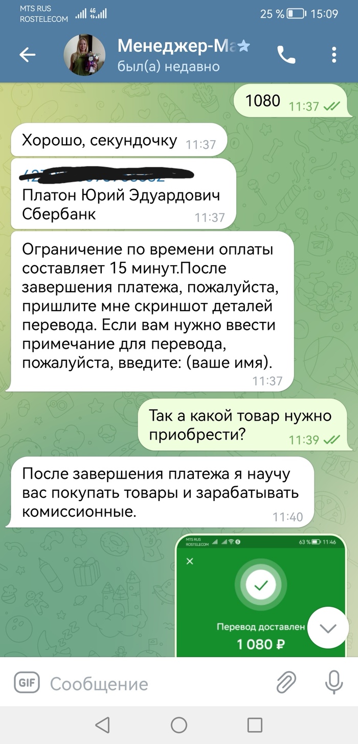 Любопытство раздирает, тем более в общем чате присылают скрины люди уже сделавшие перевод. Если разоблачать мошенников то нужно идти до конца подумала я и выбрала самый маленький тариф за 1080 руб. Не знаю можно ли на всеобщее обозрение выставлять реквизиты кому переводила (на всякий случай замазала).