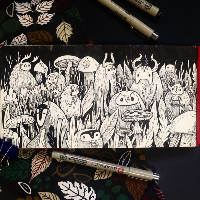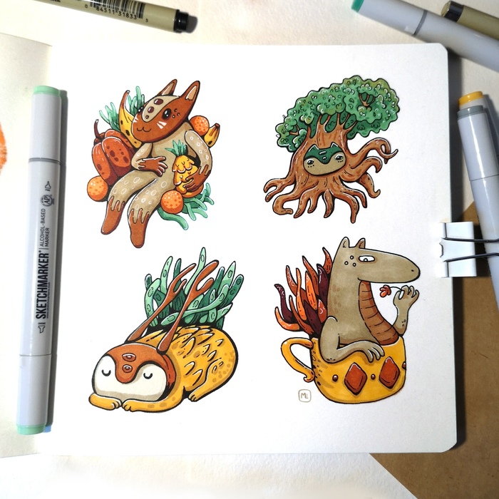Ниже рисунки, получившиеся "от пятна": разметила карандашом композицию в виде пятнышек, а потом каждое пятнышко прорисовывала, пока не получилось нечто, и это нечто уже раскрашивала) Прикольное упражнение, когда не знаешь что рисовать, но очень хочется