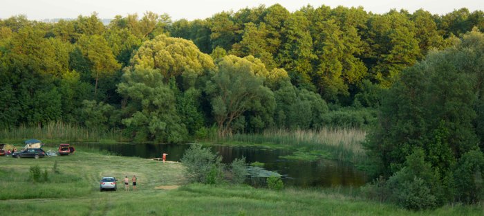 Такой метод расположения палатки предпочтительнее для тех, кто приехал на рыбалку. Удобнее контролировать удочки, все вещи находятся в поле зрения, а соответственно риск потери вещи в результате воровства минимален (хотя с кражами там за три года не сталкивались). Помимо прочего очень здорово просыпаться и наблюдать за утренней водной гладью.