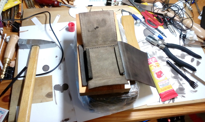 Был изготовлен макет из бумаги, а после части кошелька были вырезаны из кожи растительного дубления, но так как кожа толстая пришлось срезать часть инструментом похожим на бритву, его даже можно найти на фото.