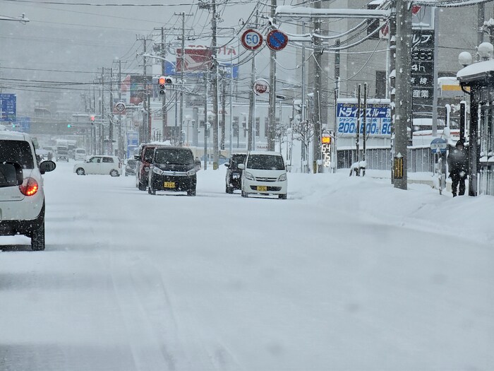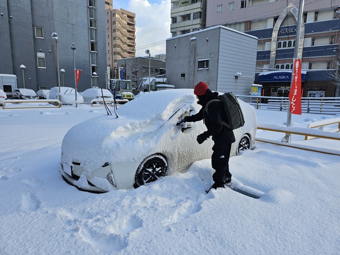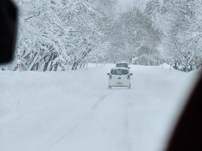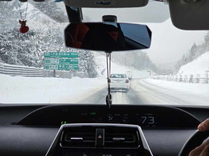 Сам город был полностью белым, никто до асфальта не вычищает дороги, но снег вывозят. Движение очень плотное и интенсивное, но без агрессии и аварий. Как я уже говорил - в Японии нет шипов и массового применения реагентов, водители просто умеют ездить зимой.