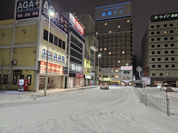 В Аомори приехали уже поздно вечером, и город приятно поразил своей чистотой и нетронутым снегом. Город немаленький, около 250 тыс населения и весь покрыт снегом. Реагентами обрабатываются только несколько улиц около центра. Скажу честно - вот так должен выглядеть город зимой. Естественно, никаких шипов, реагентов, машины аккуратно ездят по снегу.