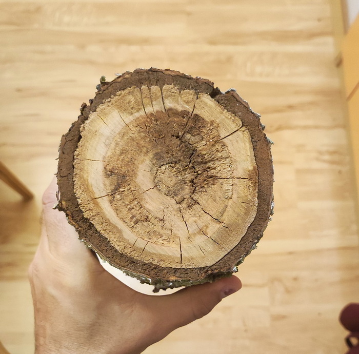 Затем поехал на дачу, откопал среди бревен сливовое полешко, которое несколько лет назад замазал на торцах мастикой для правильного высыхания. Фруктовая древесина хороша тем, что хорошо режется в любом направлении волокон. Отпилил нужный мне кусок, привез домой и через пару часов он превратился в холст из живописных трещин. Резать по такому нельзя...