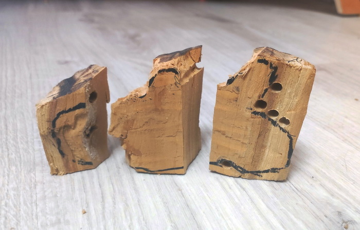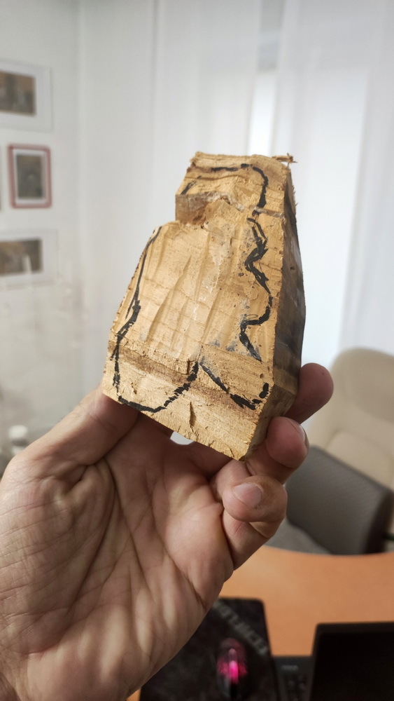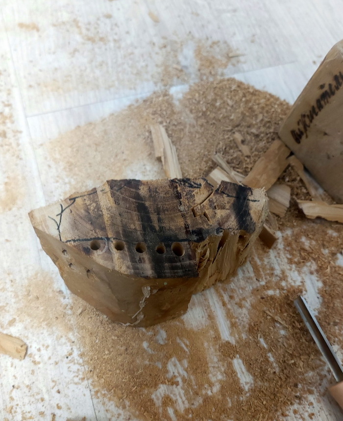 Хе-е-ерак. На очередном ударе киянки заготовка превращается в три, но поменьше... А потому что вдоль волокна надо было рисовать, а не поперек. И думать раньше, чем делать.