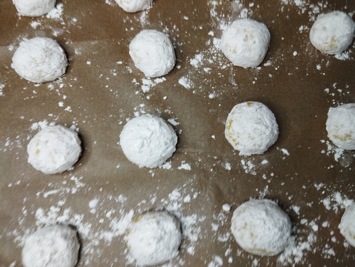 Обваливаем их как следует в сахарной пудре. И выкладываем на противень. Делать это лучше быстро, ибо сахарная пудра тает, а нам в данном случае важны красивые трещинки.