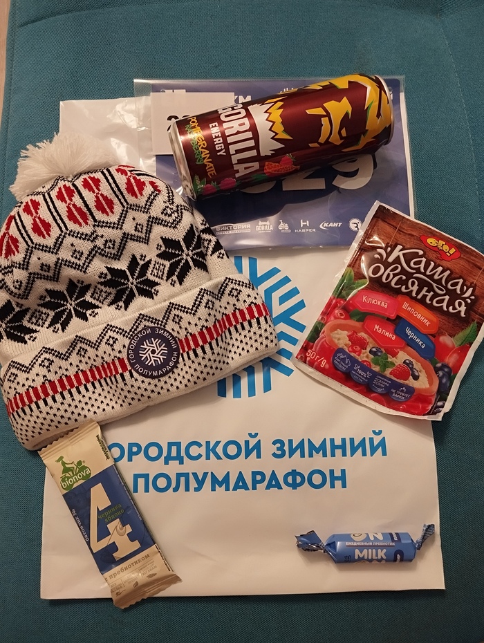 Стартовые пакеты мы забрали в субботу. И это было не очень удобно, потому что перед стартом, который был в воскресенье, их забрать уже было нельзя. Да и место выдачи было далеко от старта, видимо, поэтому и разделили дни. Смс с моим номером мне не пришло, поэтому меня послали стоять в самую длинную очередь, чтобы я смогла узнать свой номер. Стартовый пакет был с вполне стандартным содержимым, впрочем я от него ничего особенного и не ждала. В комплект вошли: шапка, энергетик, каша, батончик и конфеты без сахара.