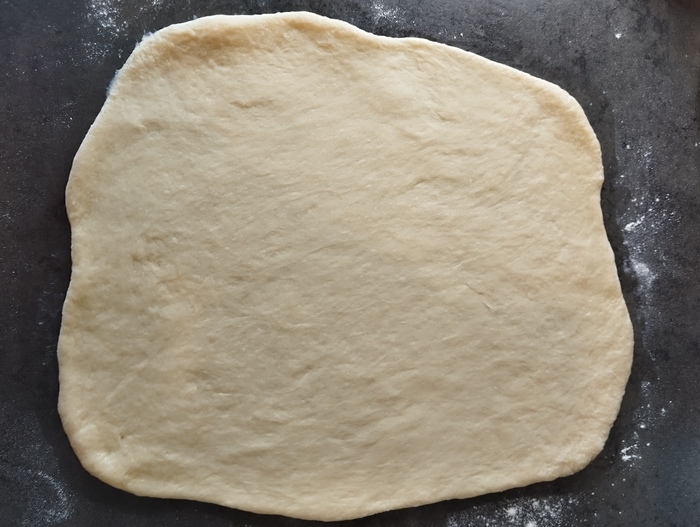 Засыпаем рабочую поверхность небольшим количеством муки и раскатываем тесто. Не нужно делать тесто слишком тонким, толщина у него должна быть примерно 5 мм.