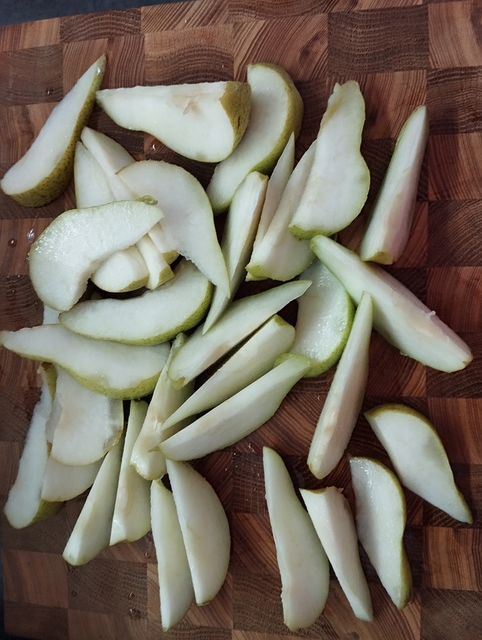 Первым делом подготовим груши. Убираем сердцевину, режем на 12 частей и сбрызгиваем лимонным соком.