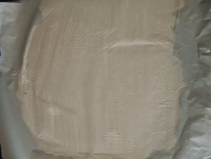 Достаем тесто из холодильника и раскатываем его между двух листов пергамента до толщины где-то в 3 мм.