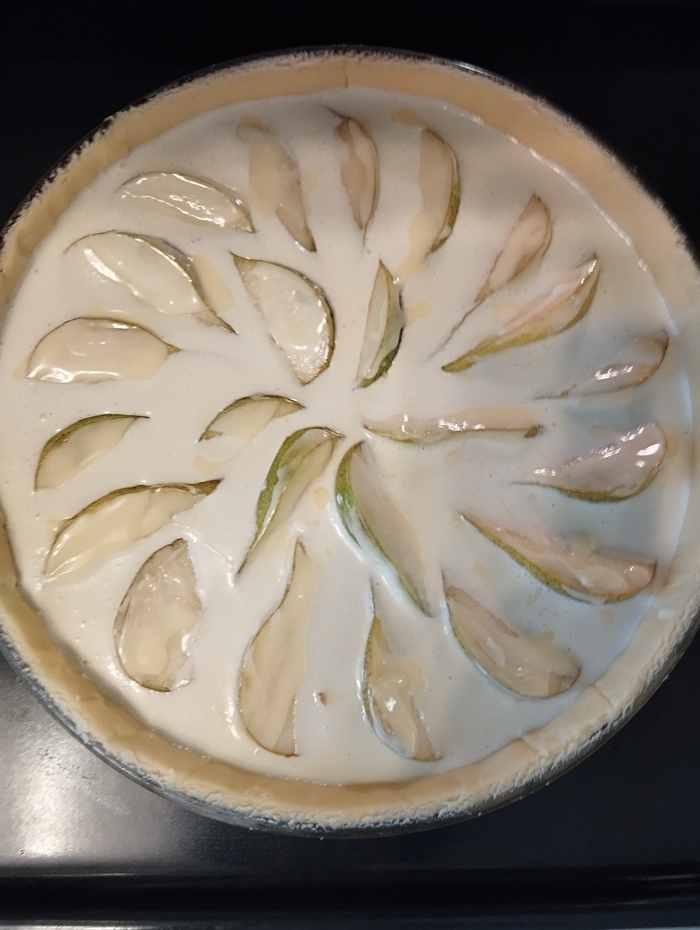Выливаем начинку и сверху выкладываем груши, которые смазываем растопленным сливочным маслом.