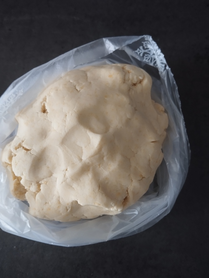 И перемешиваем. Тесто получается скорее крошкой, чем цельным комком. Так и должно быть. Собираем тесто вместе, убираем в пакет и затем в холодильник. Пусть отдохнёт, пока мы делаем начинку.