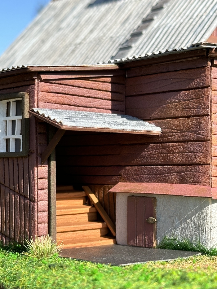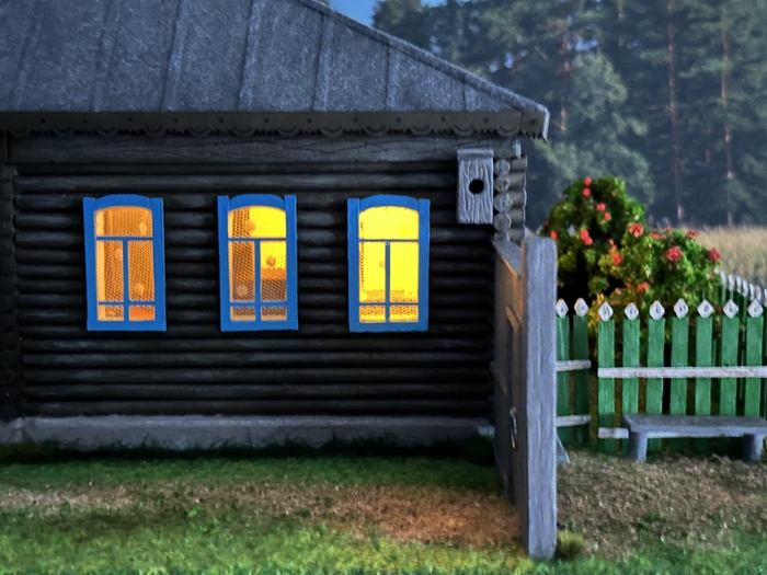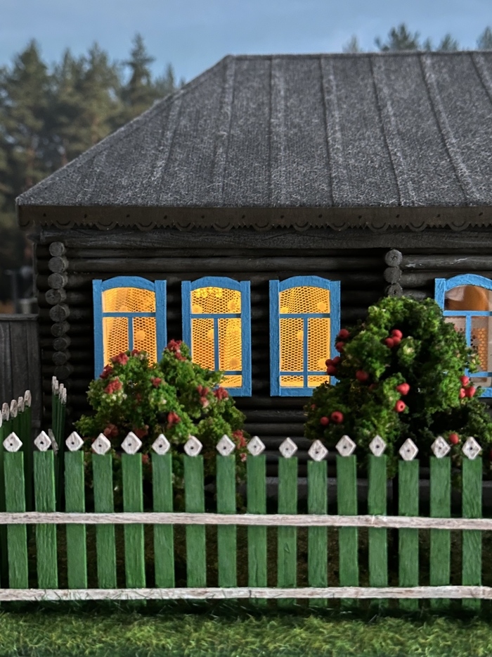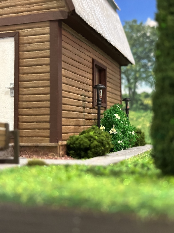 Почему же на создание этого макета ушло целых 7 недель? Потому что, во-первых, дом бревенчатый, такие дома я делаю из маленьких брёвнышек, вырезая в каждом пазы, как в настоящем доме. Это довольно трудоёмкая работа, потому что под каждое бревно я вытачиваю индивидуальный паз и только одно бревно к нему подходит, поэтому они еще и пронумерованы) зазоров между ними нет