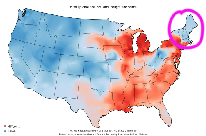 а) Cot и caught произносятся по-разному как [kʰat̚] и [kʰɔt] cоответственно. То, что было отмечено красным на карте. Встречается часто в Нью-Йорке — огромном мегаполисе и, можно сказать, одном из культурных центров США — поэтому до нас частенько доходит это произношение через фильмы, видео, музыку.