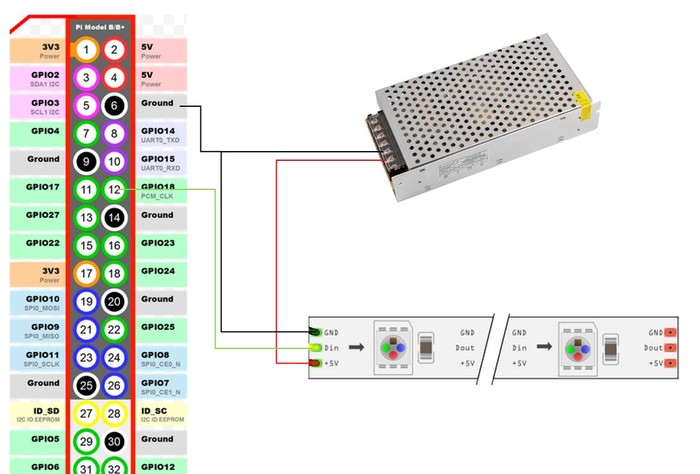 На днях собрал себе очередную игрушку на raspberry pi для загородного дома. А именно по датчику движения в коридоре будет включаться RGB лента, цель которой дать освещение достаточное для «дойти до выключателя». Не, я конечно натыкал и «проходных» выключателей аж 3 штуки, но всё равно иной раз приходиться идти до них, нащупывать их в темноте, попутно спотыкаясь о валяющуюся на полу пилу, циркуляру и электрокосу ;) Пока правда собрал «на коленке», для проверки работы ленты. Получилось примерно так: