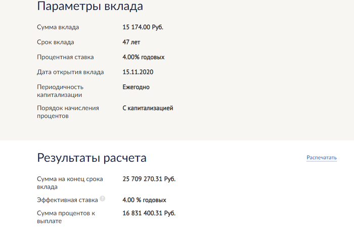 Круто не правда ли??? А теперь посчитаем в банк под средний % на эти же 47 лет.