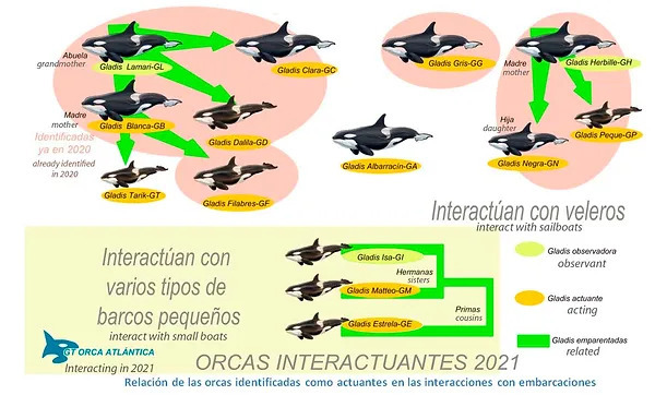 Гладис, кстати, не имя. Так (гладиаторами) португальцы называют всех косаток, замеченных не только в подобных атаках, но и вообще в частом взаимодействии с плавсредсвами. К 2022 году однозначно идентифицировали пятнадцать таких "гладиаторов", регулярно таранящих лодки и грызущих рули в районе Гибралтара. То есть, молодёжь в основном таранит и грызёт, а взрослые с картинки ниже, как я уже говорил, наблюдают со стороны.