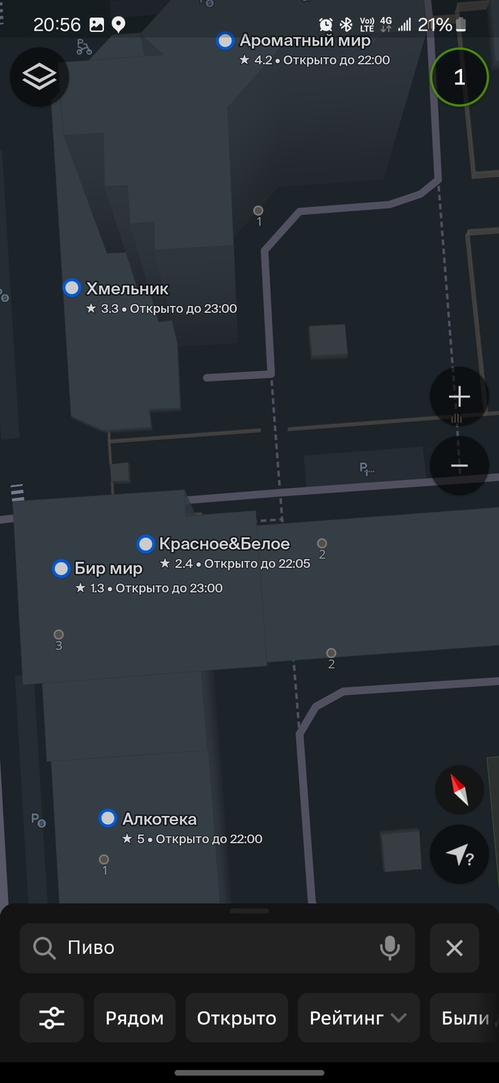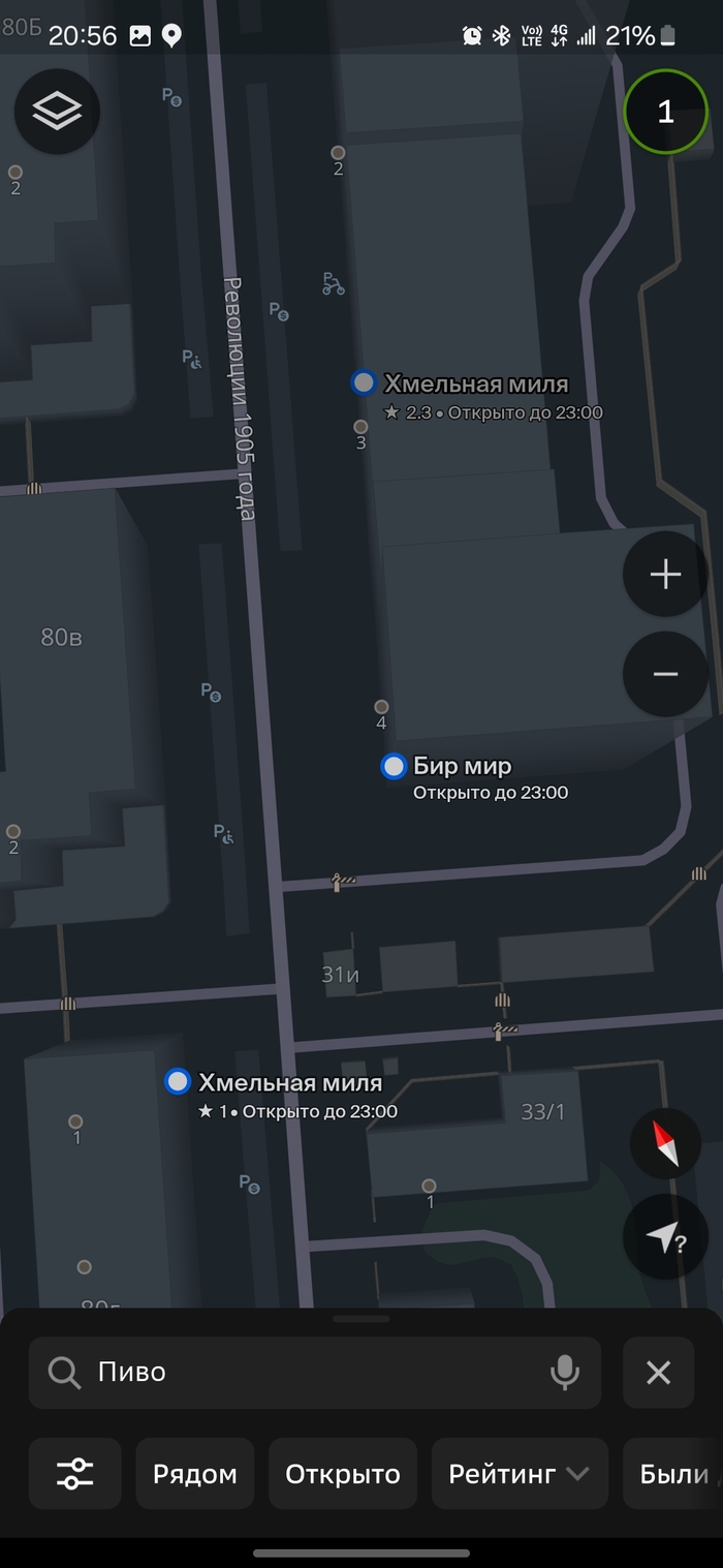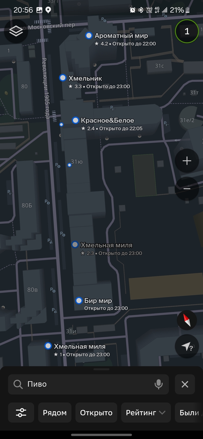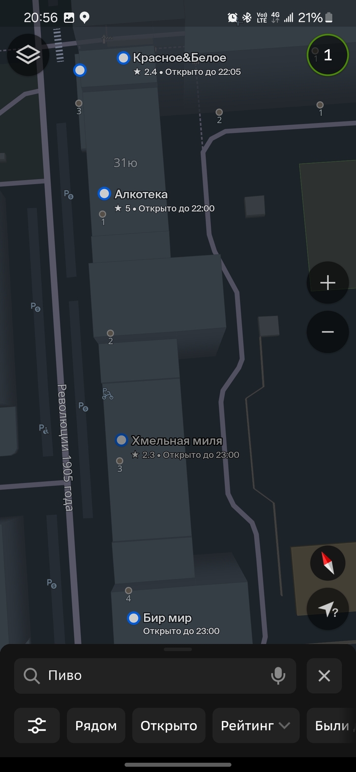 Практически центр города, вокруг достаточно свежие многоэтажки 5-10 лет. Выпал случай пешком прогуляться по противоположной стороне улицы. Броские вывески пива и алкашки в огромном количестве привлекли внимание. Решил посчитать их, ибо количество на мой взгляд в одном месте превышает разумное. Итого 8 штук на 300 м. По-моему это рекорд...(( Хочется верить, что конкуренция немного прорядит эту локацию.