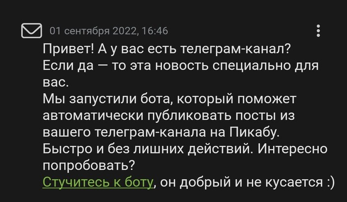 @moderator, на Пикабу есть довольно большая прослойка общества, которым не нравится посты с телеграмм каналов. Да, существует тег телеграмм, который можно заигнорить, но из-за этого можно пропустить пост про сам телеграмм. Я думаю, не трудно создать автоматический тег(как тег текс), который будет становится на посты с ссылкой на телеграмм канал.