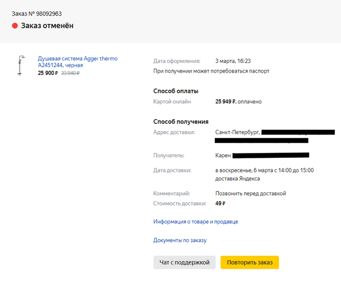 И возможно я бы и плюнул на эту кнопку, взял бы возврат, но до этого, 5 марта очередной продаван Яндекса, решил отменить заказ, патамушта… Скорее всего посчитал, что практически 26 тысяч за душ, это мало, ведь он стоит уже 34 тысячи. Зачем же ему терять его прекрасные шекели.