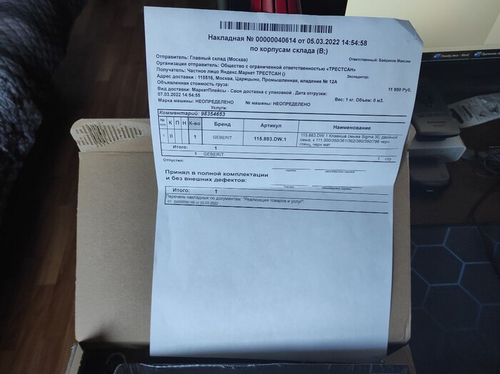 09.03.2022 курьер вручил мне без возможности проверки(все мы знаем как работает Яндекс доставка) замотанную в целлофан по самое не хочу, заветную коробку и спешно улетел по лестнице, но.. Меня ожидало разочарование, внутри, под слоями целлофана оказалась вскрытая коробка (она должна быть заклеена наглухо с завода) с совершенно другой кнопкой(115.883.DW.1), серийник который указан просто везде, на коробке, внутри на бумажках, а так же на накладной бережно запиханной внутрь поставщиком Яндекса. Как можно было ошибиться при таких условиях не ясно, если только не специально.