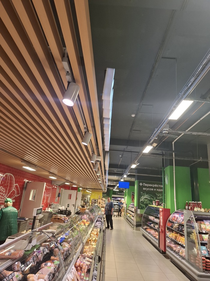 Впереди отдел с мясом, рыбой, кулинарией. У каждого отдела свое освещение. Задача этой линии осветить только проходы и торцевые стелажи сзади если они есть или будут. Зачастую сначала в магазине делают ремонтные работы, а уже потом перестановку.