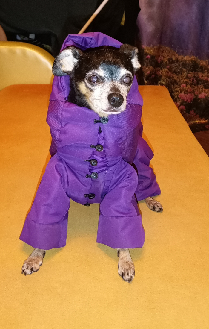 Потом пёсыч стал стареть, долгие прогулки в шубе стали неудобными, и я сшила ему зимний комбез из моих бывших мембранных штанищ.