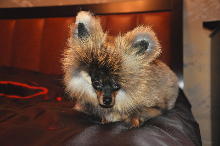 Ко второй зиме собакен возмужал, достиг возраста полутора лет с небольшим и окончательно вырос из комбеза. Покупать новую говняку хотелось не очень, а на антресоли лежали шкура лисы и остатки мехов кажется норки (но это не точно). Сложив эти факты, было решено сшить собаке шубу своими руками. Получилось забавно и очень тепло.
