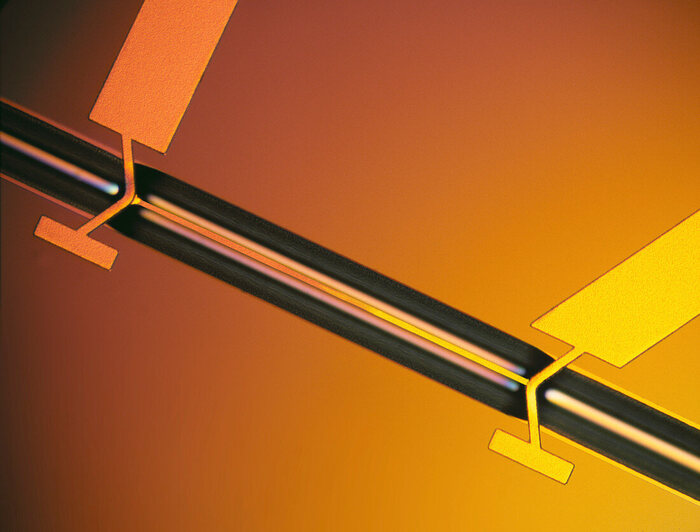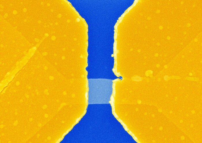 6. Микрофотография транзистора, состоящего из графеновой проволоки (в центре), золотых электродов (темно-желтый) и кремния (синий). Графеновая проволока имеет ширину 200 нанометров (миллиардных долей метра). Графен состоит из одного слоя атомов углерода, расположенных в виде сотовой кристаллической решетки. Он одновременно гибкий и очень прочный. Он проводит электроны быстрее, чем кремний, и однажды может заменить кремний в таких областях, как нанометровая (миллиардные доли метра) электроника, дешевые и эффективные солнечные панели, прозрачные оконные покрытия и технологии миниатюрных датчиков. Графен был открыт Андреем Геймом в 2004 году. Увеличение: нет данных.