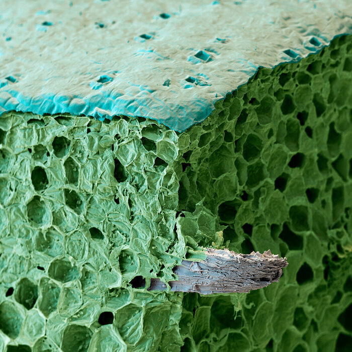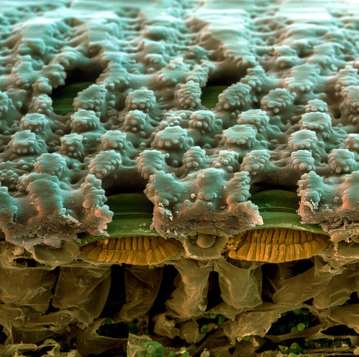 5. Срез стебля хвоща (Equisetum giganteum). Газы входят и выходят из стебля через устьица (поры) в его внешнем слое или эпидермисе (серый цвет). Устьица окружены замыкающими клетками (зелено-коричневого цвета). Фотосинтез происходит в хлоропластах (крошечные зеленые сферы, такие как внизу в центре) клеток паренхимы стебля (коричневые). Хвощи (отдел Sphenophyta) — сосудистые растения с полым членистым стеблем и чешуйчатыми листьями. E. giganteum, произрастающий в американских тропиках, может достигать более 9 метров в длину. Увеличение: х400 при размере 6х6 см.