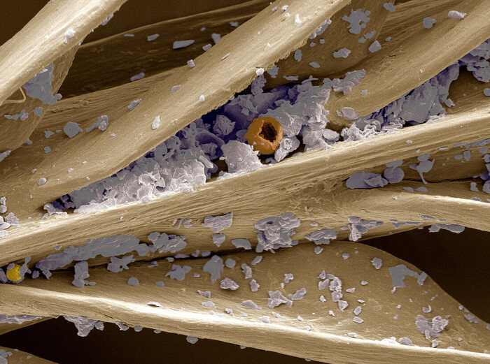 4. На фото показан разрез ткани из стекловолокна. Ткани из стекловолокна часто заливают полиэфирными смолами, и таким образом, можно производить легкие и чрезвычайно прочные панели для кузовов автомобилей, для строительства самолетов или для изготовления электронных схем. Эта ткань была сделана еще более термостойкой с помощью нанопокрытия. Увеличение 42:1 (при размере изображения 12х12см)